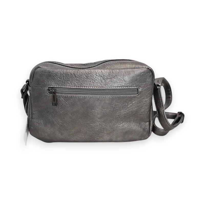 This Mélanie Paris crossbody bag combines elegance and practicality with its contemporary design in metallic gray synthetic material. Its premium finish perfectly imitates genuine leather, offering a high-end look at an affordable price. Equipped with multiple compartments including two front pockets with silver flaps and magnetic closures, it adapts perfectly to daily use.