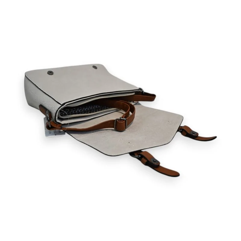 The crossbody bag from the Mélanie Paris collection stands out with its sleek and modern design. The combination of beige synthetic material and shiny silver flap creates an elegant contrast, enhanced by the camel straps that add a touch of warmth to the overall look. This blend of neutral tones allows for versatility in outfits, adapting well to both casual and more dressy styles. The metallic finish of the flap subtly captures light, giving the bag a precious and refined appearance.