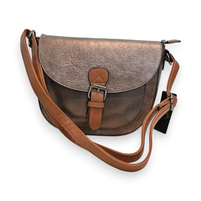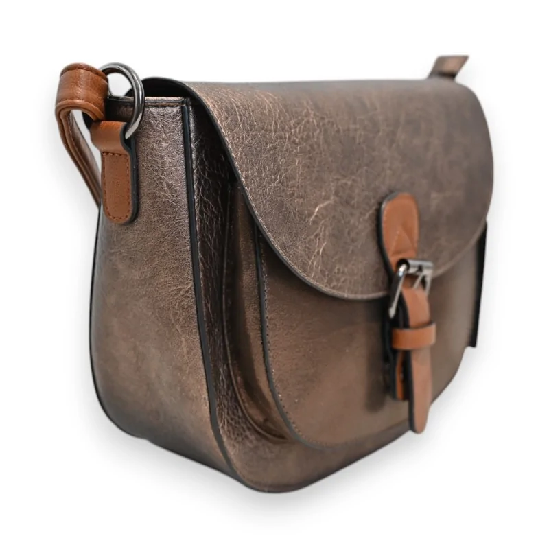 The Mélanie Paris crossbody bag captivates with its contemporary design and metallic brown synthetic finish that gives it a premium look. The combination of metallic bronze with glossy brown details creates an elegant and sophisticated contrast. The rounded flap, a signature of the brand, harmonizes perfectly with the overall silhouette of the bag, while the decorative metal buckle adds an extra touch of refinement.