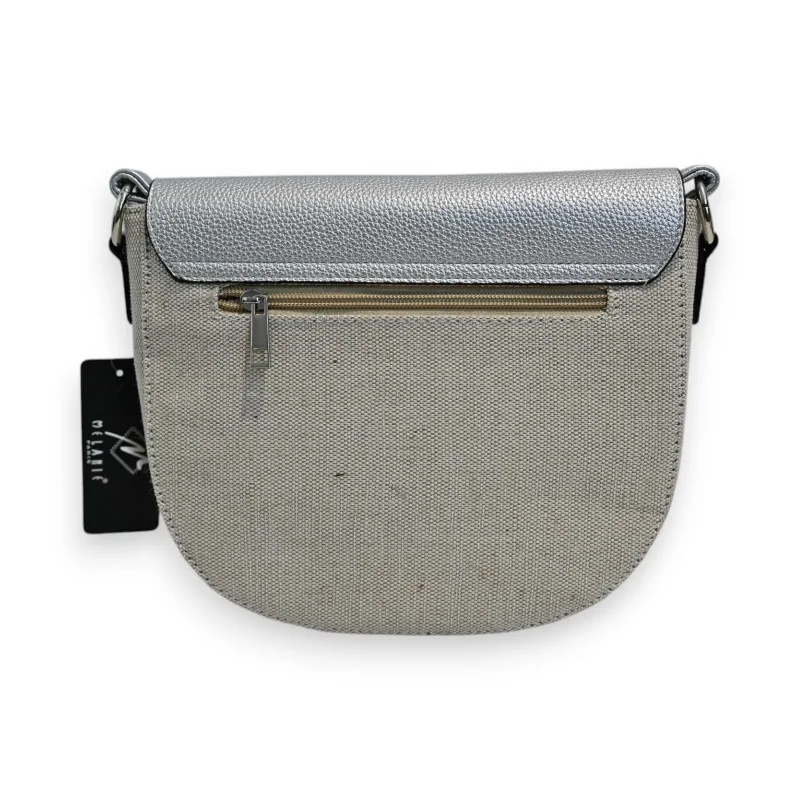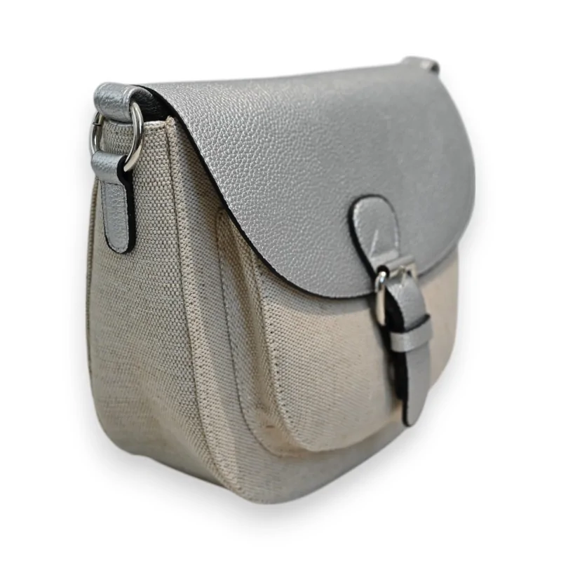 The crossbody bag from the Mélanie Paris collection stands out with its careful design combining noble materials and refined finishes. The combination of beige linen enhanced with silver lurex threads and metallic synthetic creates an elegant and contemporary contrast. The rounded flap with silver finish harmonizes perfectly with the matching strap, offering a magnetic closure that is both practical and secure.