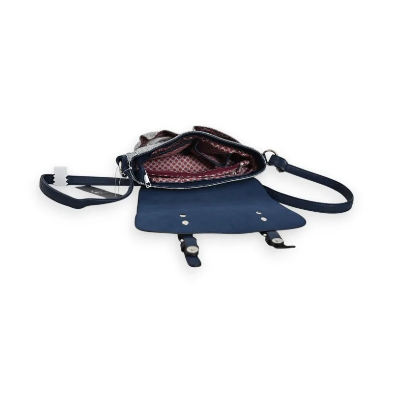This shoulder bag from the Mélanie Paris collection combines elegance and practicality with its bi-material design, associating navy blue synthetic fabric and speckled linen with silver reflections. Its distinctive satchel style is emphasized by two decorative straps on the flap, offering a retro-chic touch to the ensemble.
