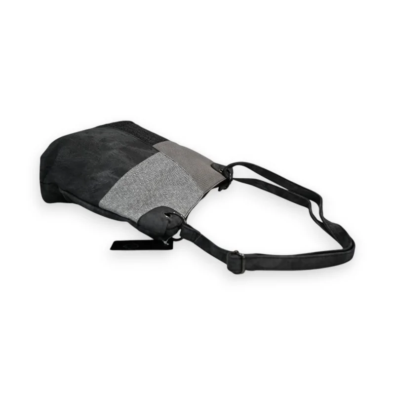 The Mélanie Paris crossbody bag stands out with its contemporary design blending different textures in a patchwork style. Its composition in faded gray synthetic material gives it a trendy and urban look. The model offers great storage capacity thanks to its compartmentalized central pocket and multiple side pockets.