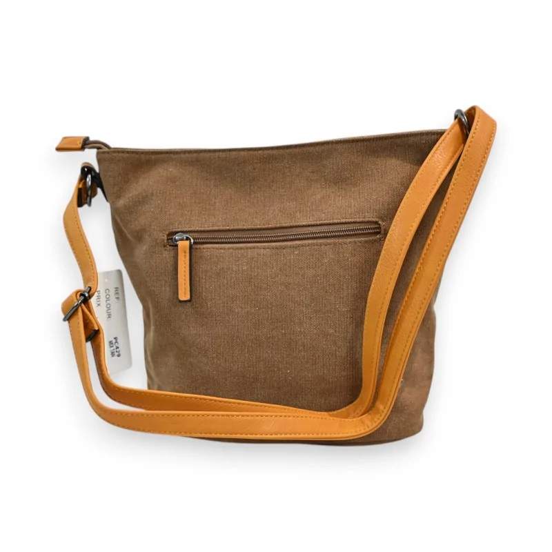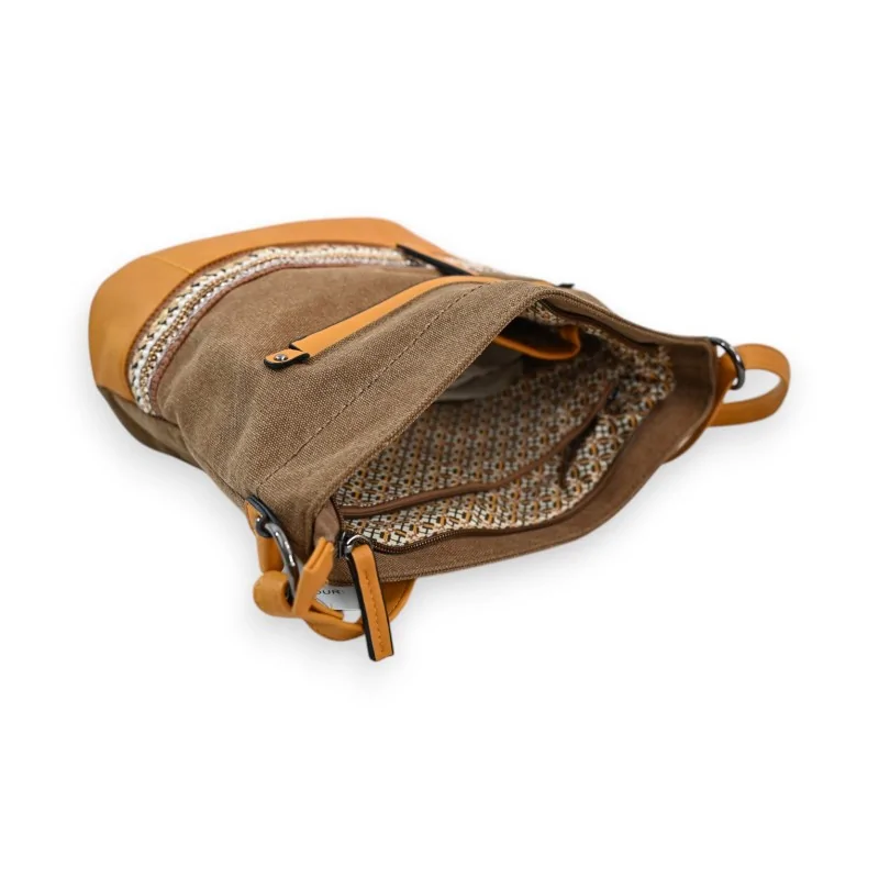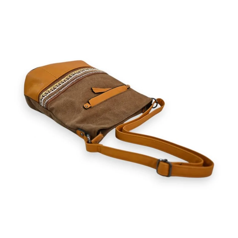 The Mélanie Paris crossbody bag embodies the perfect blend of bohemian style and practicality. Its dual-material design in denim and synthetic fabric offers a unique look, enhanced by a decorative band with ethnic patterns. The brown and mustard tones harmonize elegantly, creating a versatile accessory that complements many outfits.