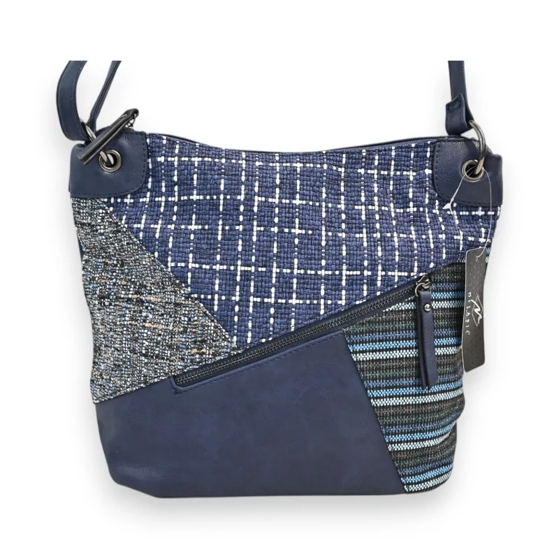 The crossbody bag from the Mélanie Paris collection stands out with its contemporary design that harmoniously blends different textures. The main part in navy blue synthetic material is enhanced by a refined patchwork incorporating geometric patterns and subtly coordinated shades of blue. This unique composition creates an accessory that is both trendy and timeless, perfectly adapted to the demands of modern daily life.