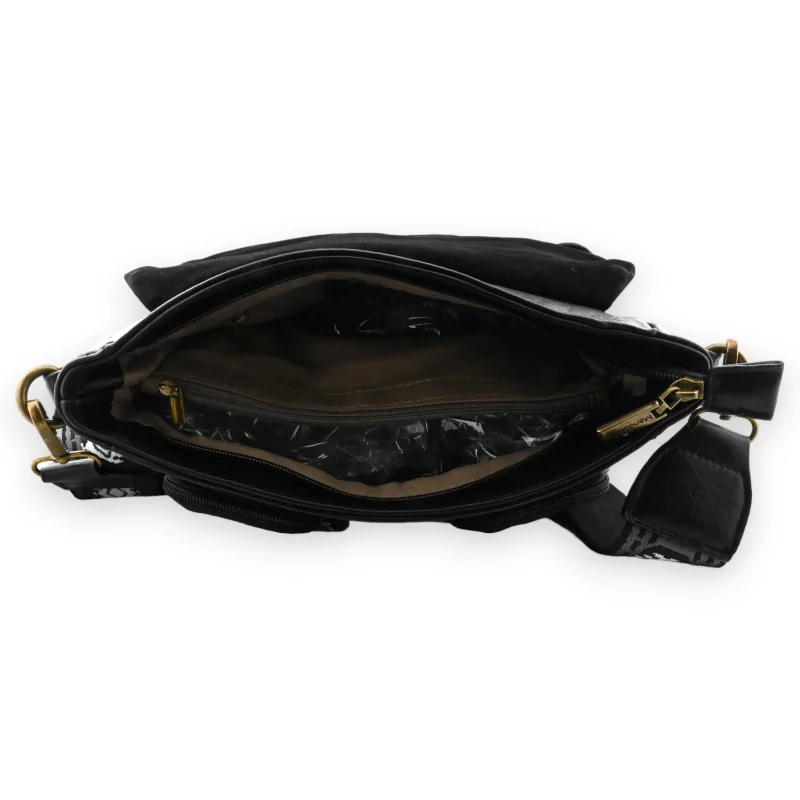 This elegant and functional black shoulder bag stands out with its remarkable patterned fabric strap, adding a touch of originality. On the front there are two visible pockets securely fastened with zippers, ideal for quick access to your essentials. In addition to the main zipper closure, the bag features a rounded flap cleverly integrating an additional pocket for more storage space. The interior is designed for optimal organization: a spacious central pocket is complemented by plated pockets. Additionally, a further pocket is located at the back of the bag, providing a discreet space for small items. With dimensions of 30x22 cm, this bag combines style and practicality for everyday use.