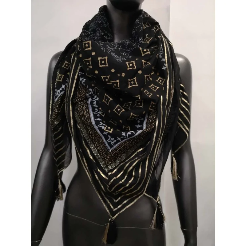 This magnificent black and gold ethnic square scarf brings a touch of elegance to all your outfits. Made from pure viscose, it measures 120x120cm and features sophisticated geometric patterns with golden highlights. Its fluid material and generous size allow for multiple ways to wear it with style and comfort.