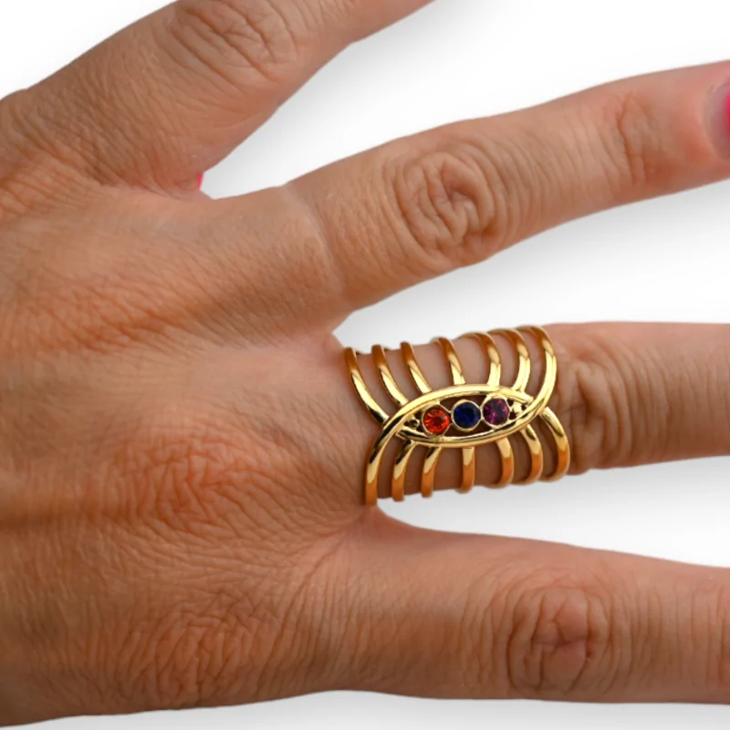 This stunning gold ring redefines the art of contemporary jewelry with its unique and sophisticated multi-ring design. Created for women who appreciate refined details, it perfectly combines modernity and timeless elegance. Its innovative adjustable system allows comfortable wear for finger sizes 18 to 19, offering the possibility to tighten or loosen the ring slightly according to your preferences. The 3 small colored stones harmoniously arranged on top create a captivating visual effect that draws all eyes. The careful gold-plated stainless steel finish guarantees exceptional resistance while maintaining its authentic golden shine over time.