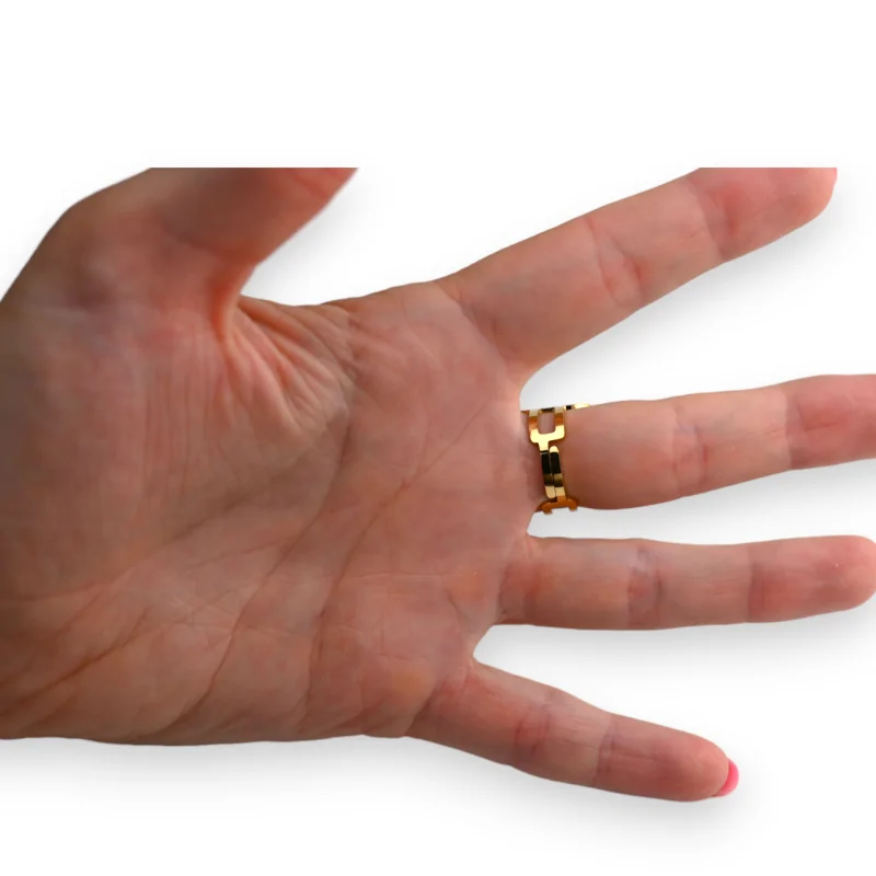 This ring, crafted from stainless steel and finished with a gold coating, embodies finesse and delicacy. Its unique design features a double shank, delicately intertwining in the middle to form a small knot of rare elegance. This subtle representation of a knot makes the ring both fashionable and timeless. Furthermore, its adjustable structure ensures a perfect fit on any finger, making it comfortable to wear.