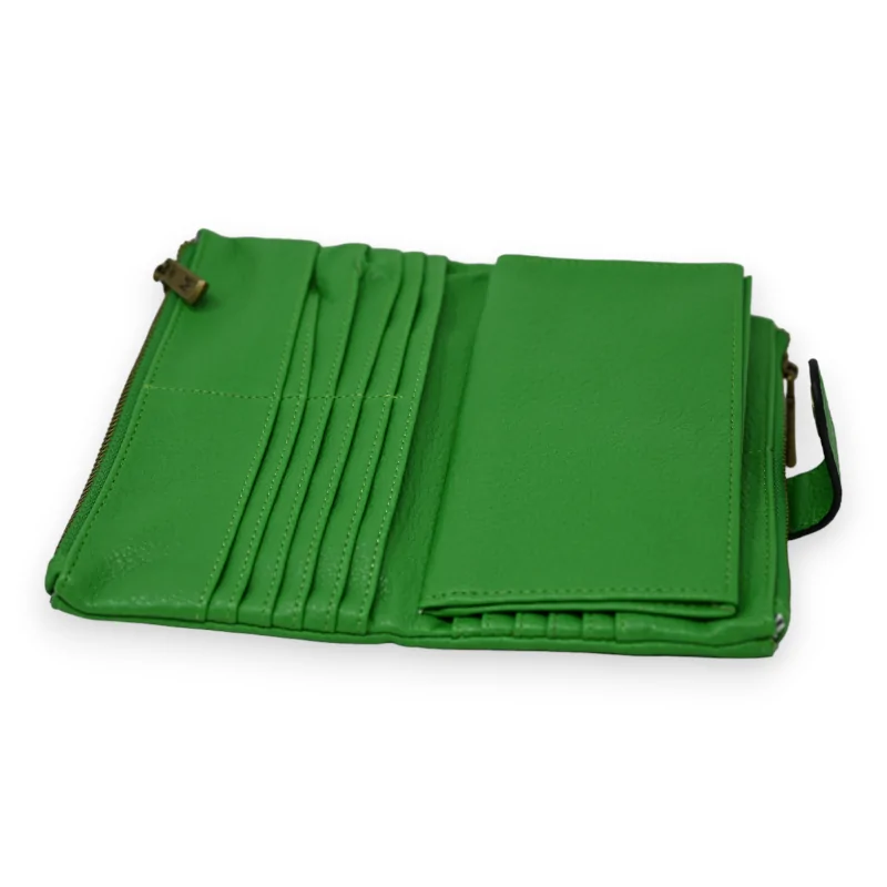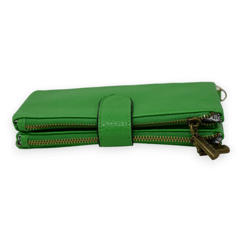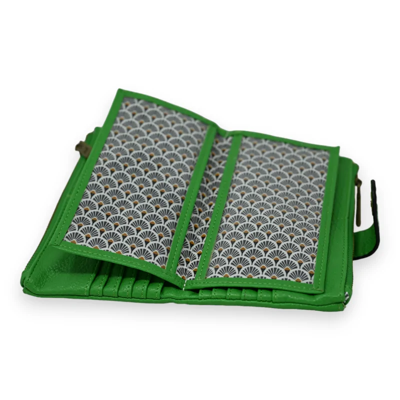 Opt for modernity with this unified Brazilian green shaded companion wallet, designed for those who value both style and efficiency. Its magnetic opening simplifies access to your essentials, while the side zip pockets offer a practical solution for coins. Inside, you will find an organized space capable of accommodating a checkbook among other necessities, all carefully wrapped in a charming vintage lining. Measuring 19x12 cm, this wallet fits perfectly in your bag, ensuring optimal organization with a touch of discreet elegance.
