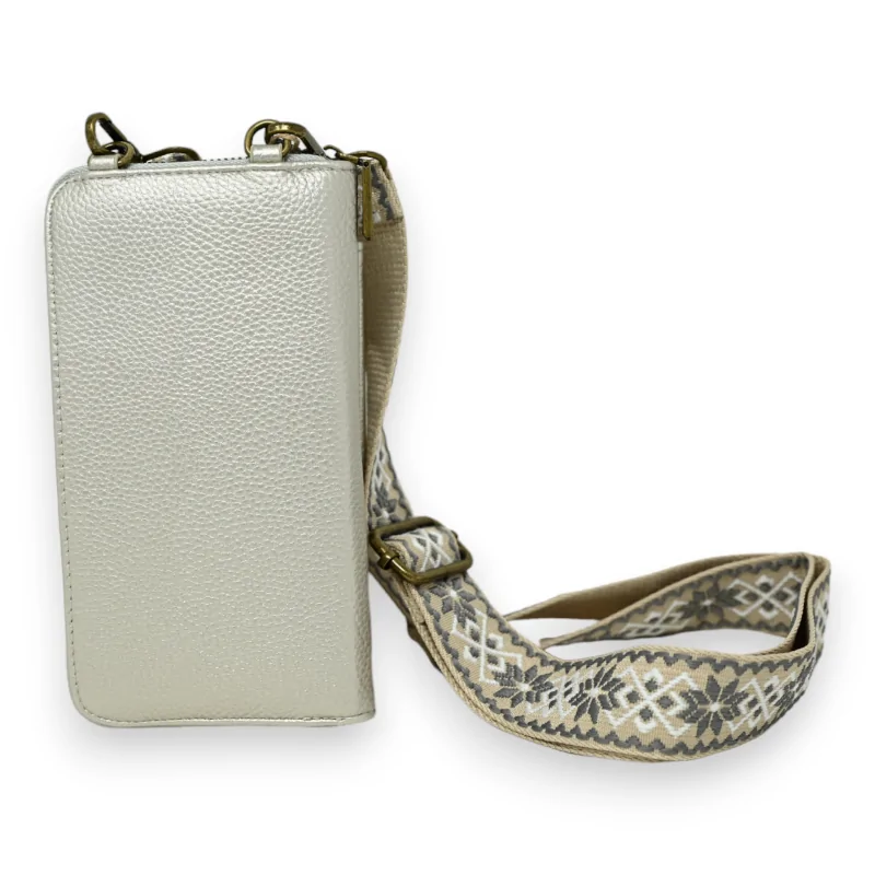 Discover this versatile crossbody pouch, presented in an attractive pearly beige, gracefully combining a dedicated phone space and an integrated wallet. The adjustable strap, adorned with a fabric print in perfect harmony with the color of the pouch, adds a touch of refinement and ensures customized comfort. On the front, a pocket specifically designed for your phone or other essentials ensures easy and secure access thanks to its zip closure. The interior is a marvel of organization, offering specific compartments for your cards, coins, and more, making this accessory ideal for travel or everyday life. Precise dimensions: the phone pouch is 9x16 cm with a depth of 2 cm, while the whole measures 20x10.5 cm, combining functionality and style.