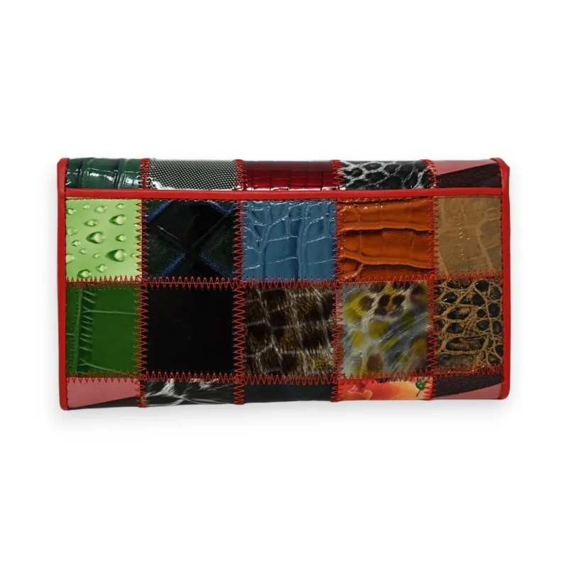 Explore the sophistication and functionality with our patchwork leather portfolio, a piece where the art of color meets daily utility. Its unique design incorporates a diverse color palette, magnified by a glossy coating and bold red borders. Ideal for meticulous organization, this wallet includes multiple card slots, a space for your checkbook, and a zippered pouch to secure your change. Compact with dimensions of 20 x 11 cm, it perfectly fits into dynamic urban life, combining style and practicality.