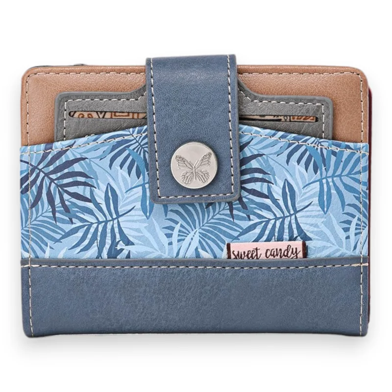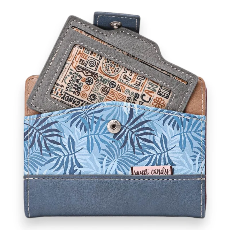 Discover the wallet and purse from the Sweet & Candy brand, adorned with a beautiful tropical forest print in shades of blue, enhanced with touches of pastel and soft colors. Practical and compact, it is designed to be taken everywhere with you. It includes a compartment for coins with a zip closure, a space for cards, a detachable section for even more cards, and a compartment for bills. The interior is meticulously finished, offering a stylish and functional look. Dimensions: 12.6 x 10 cm. Version 2: