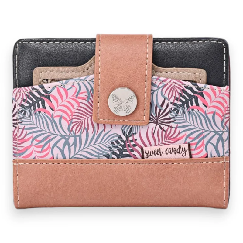The Sweet & Candy Tropical Forest wallet stands out with its unique style and optimal functionality. Its tropical print in shades of pink and black, embellished with delicate pastel touches, makes it both trendy and timeless. This compact 12.6 x 10 cm model fits perfectly into all your bags, allowing you to take it everywhere without bulk. Combining aesthetics and practicality, this wallet will quickly become your essential daily companion.
