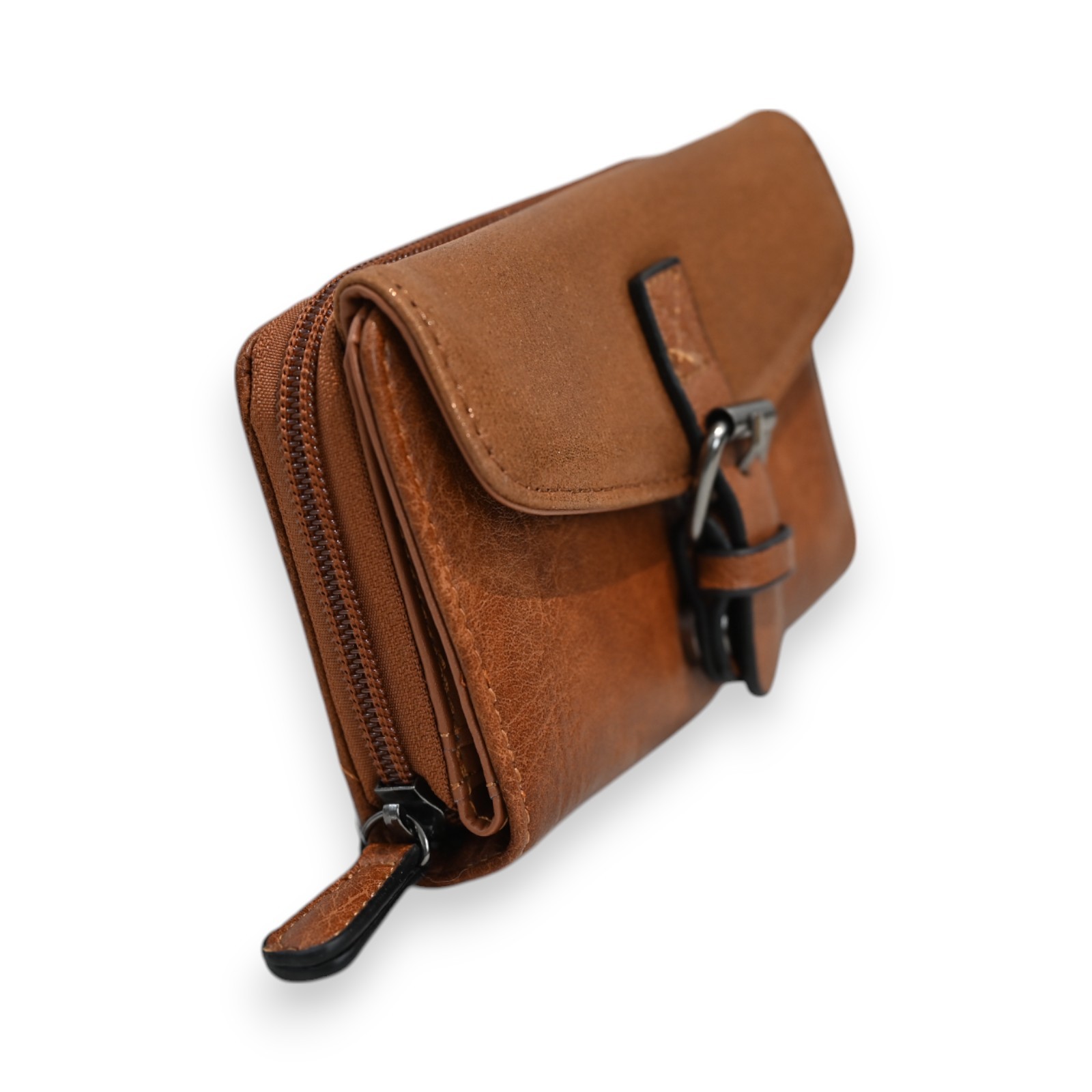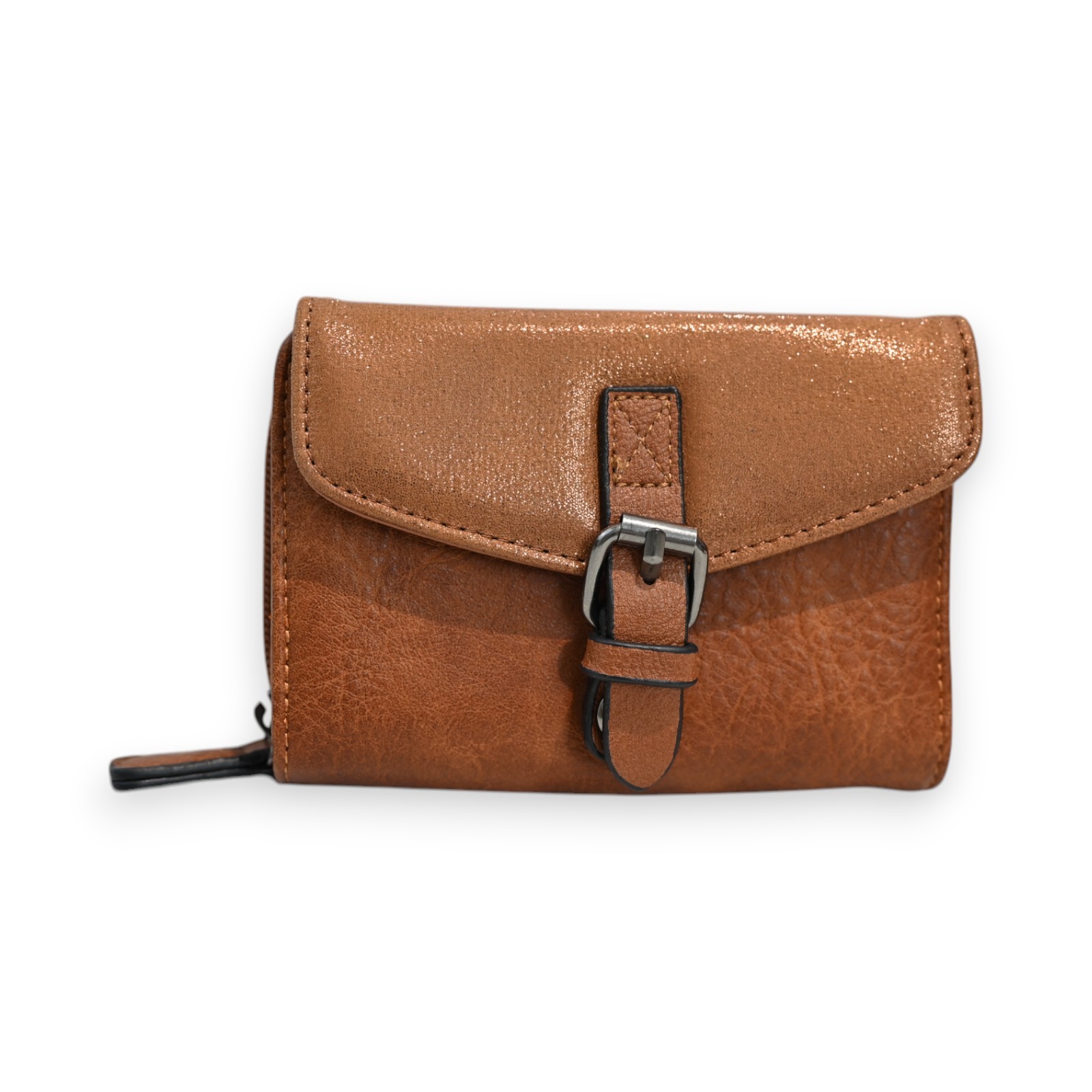 The Mélanie Paris wallet stands out with its contemporary style and sophisticated camel finish. The glossy texture of the flap adds a touch of refinement, while the decorative strap and metal clasp create an elegant contrast. The brand has paid particular attention to manufacturing details, with precise stitching and impeccable finishing that demonstrate meticulous craftsmanship.