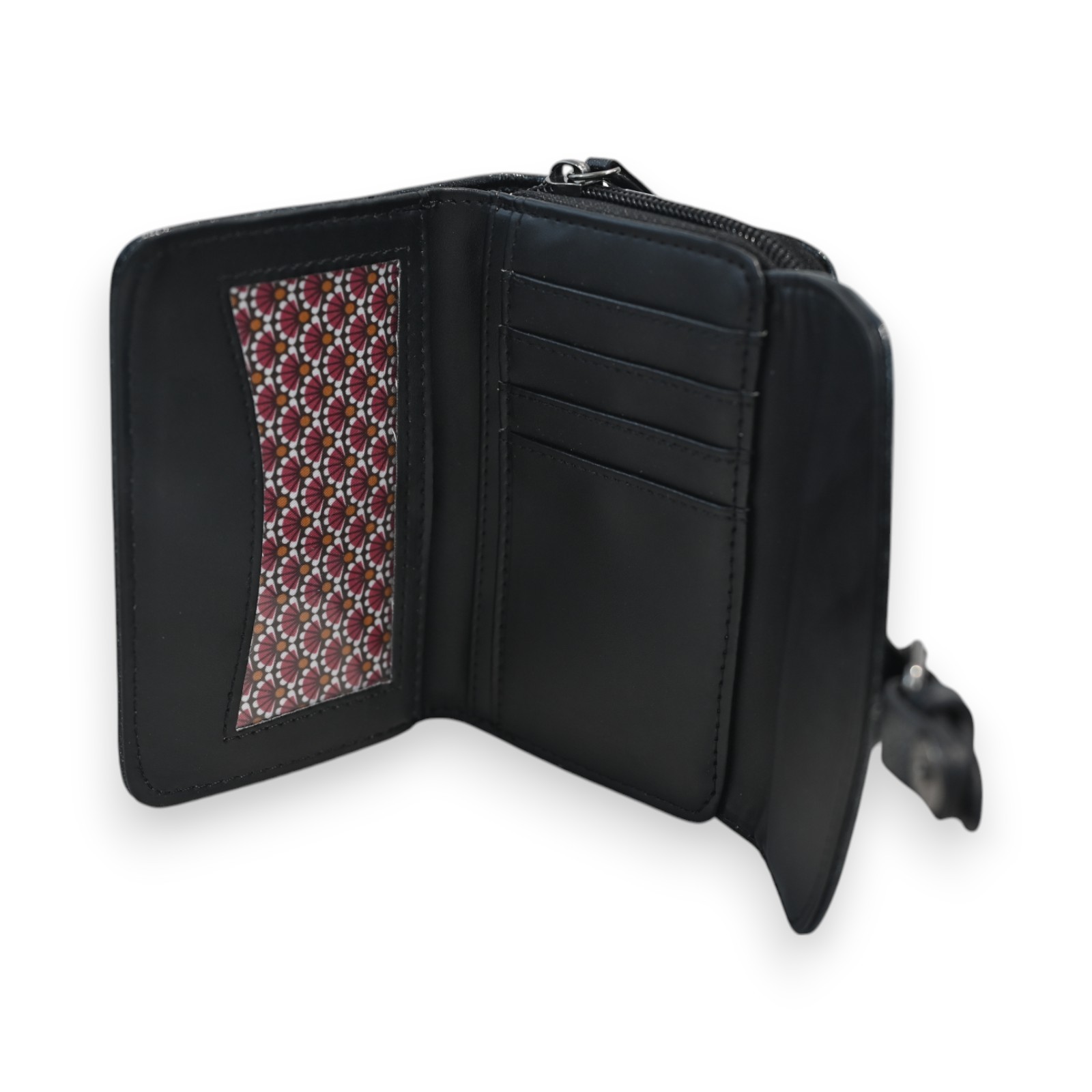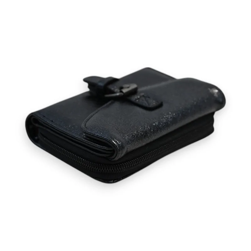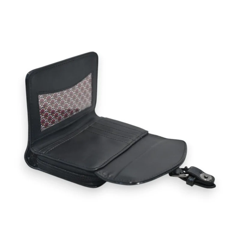 The compact Mélanie Paris wallet combines style and functionality in an ideal format for everyday use. Its glossy black synthetic finish gives it a sophisticated look, while its ingenious storage system allows for easy organization of cards, coins, and bills. With dimensions of 14 x 9 x 2.5 cm, it fits perfectly in all bags.
