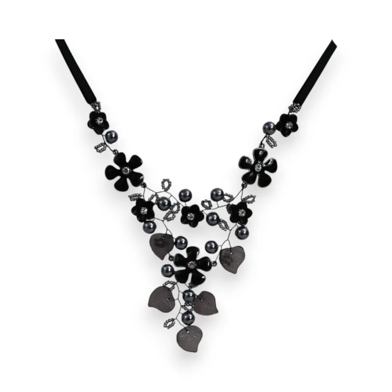 A true centerpiece of your outfit, this fashion jewelry combines elegance and originality. The black floral motifs highlighted with shiny details and matching leaves create a harmonious ensemble ideal for accessorizing your evening attire or ceremony looks.