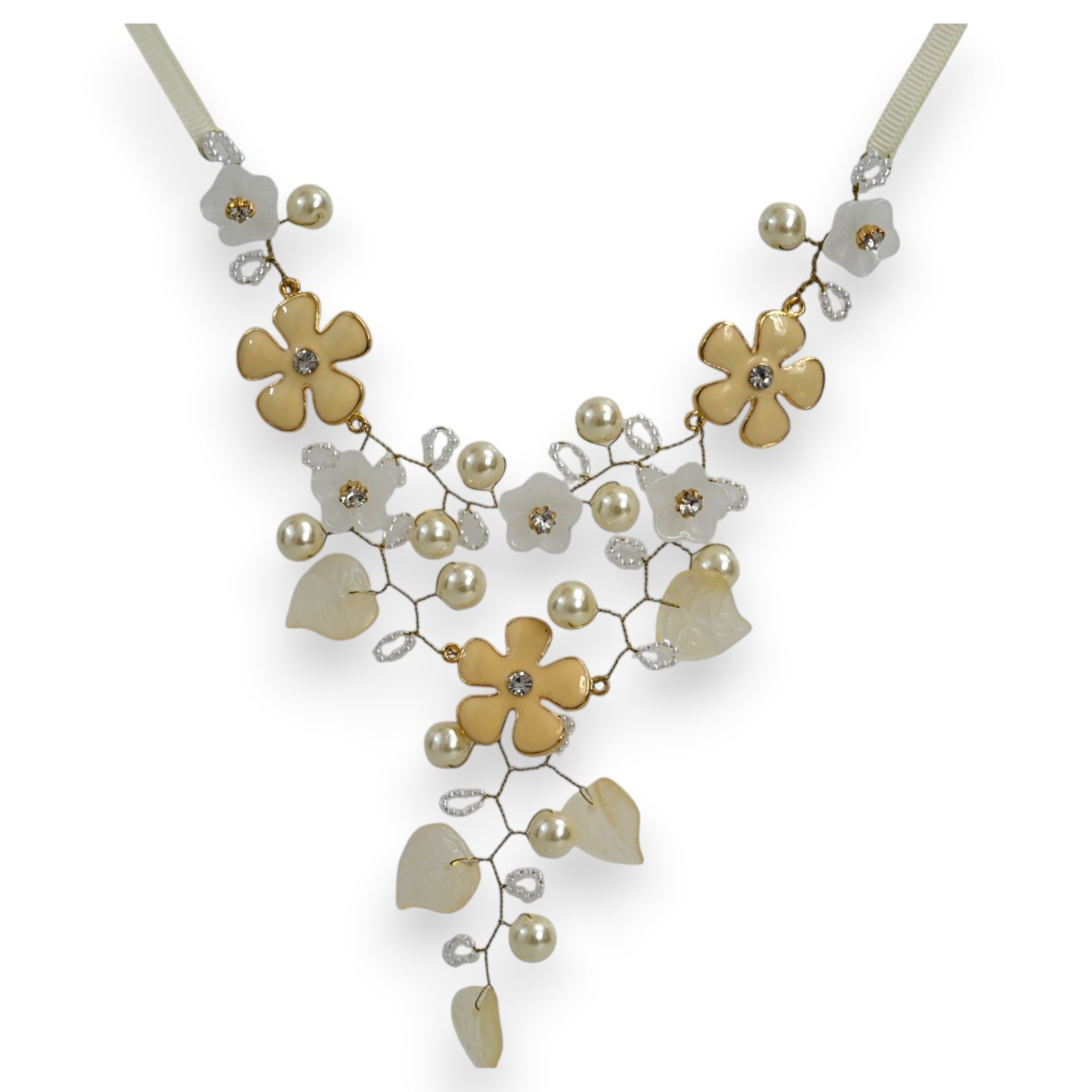 This costume necklace embodies the creative expertise of the Ikita brand. The centerpiece consists of a sophisticated floral arrangement where golden and white flowers intertwine, creating a graceful vegetal pattern. Each element is meticulously assembled on an ivory satin cord, offering a comfortable and elegant wear. The delicately arranged pearls bring a touch of luminosity and movement to the ensemble.