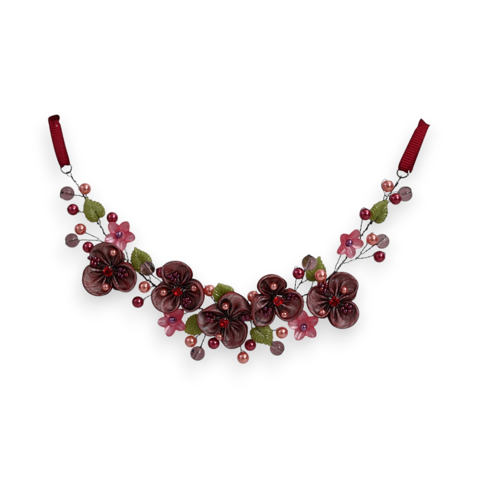 This unique piece stands out for its romantic style and harmonious composition. The flowers in burgundy and pink tones create a sophisticated cascade effect, while the small pearls add a subtle touch of sparkle. An ideal accessory to enhance both an evening outfit and a casual look.