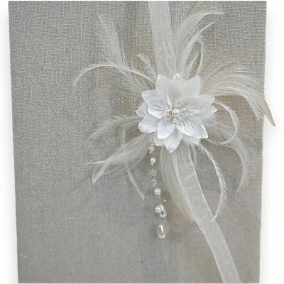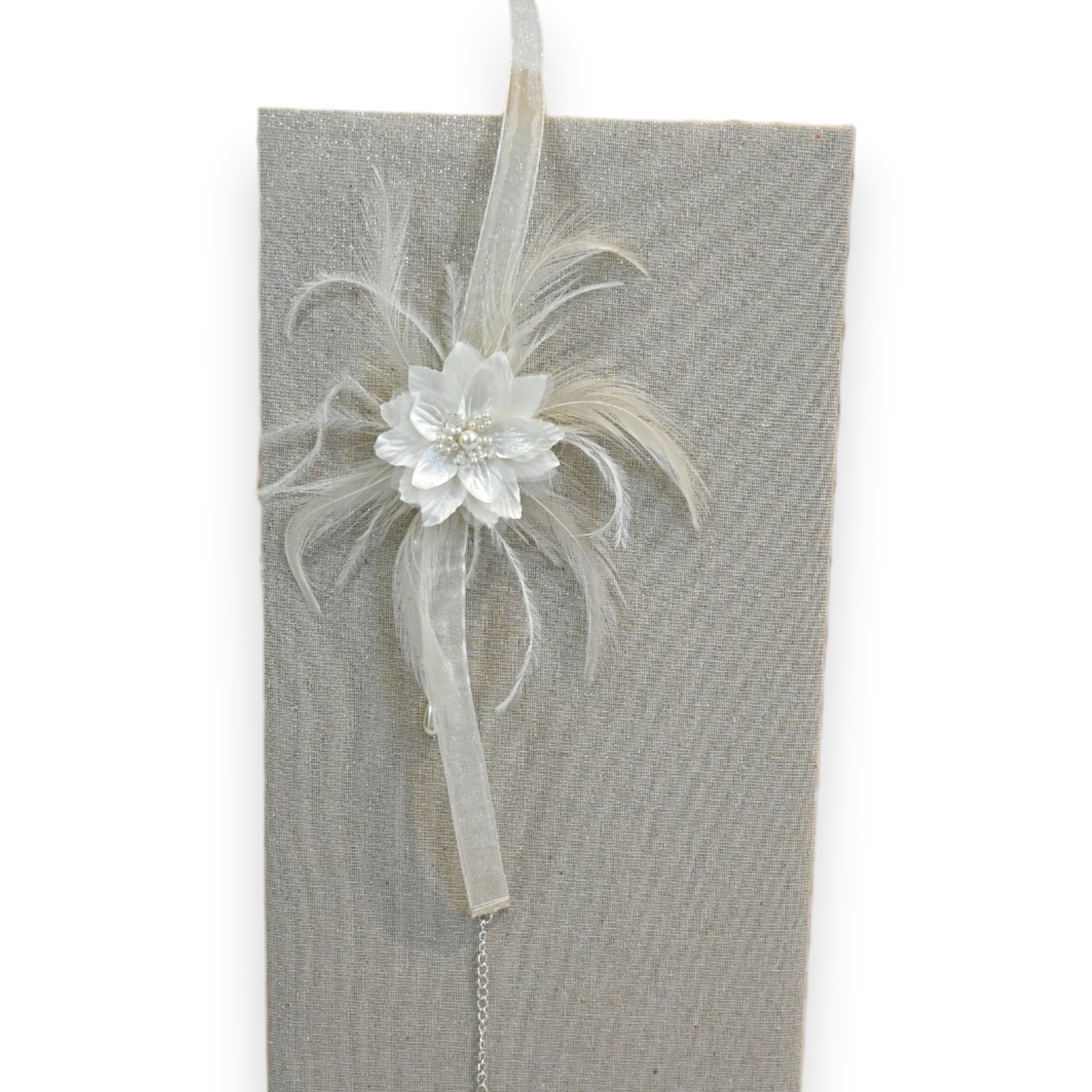 This white choker stands out with its contemporary design that brilliantly combines different textures and materials. The meticulously crafted central fabric flower is the focal point of the jewelry. The scattered delicate pearls create subtle reflections that catch the light, while the white feathers add a touch of lightness and movement. The harmonious assembly of these elements forms a piece that is both sophisticated and romantic.