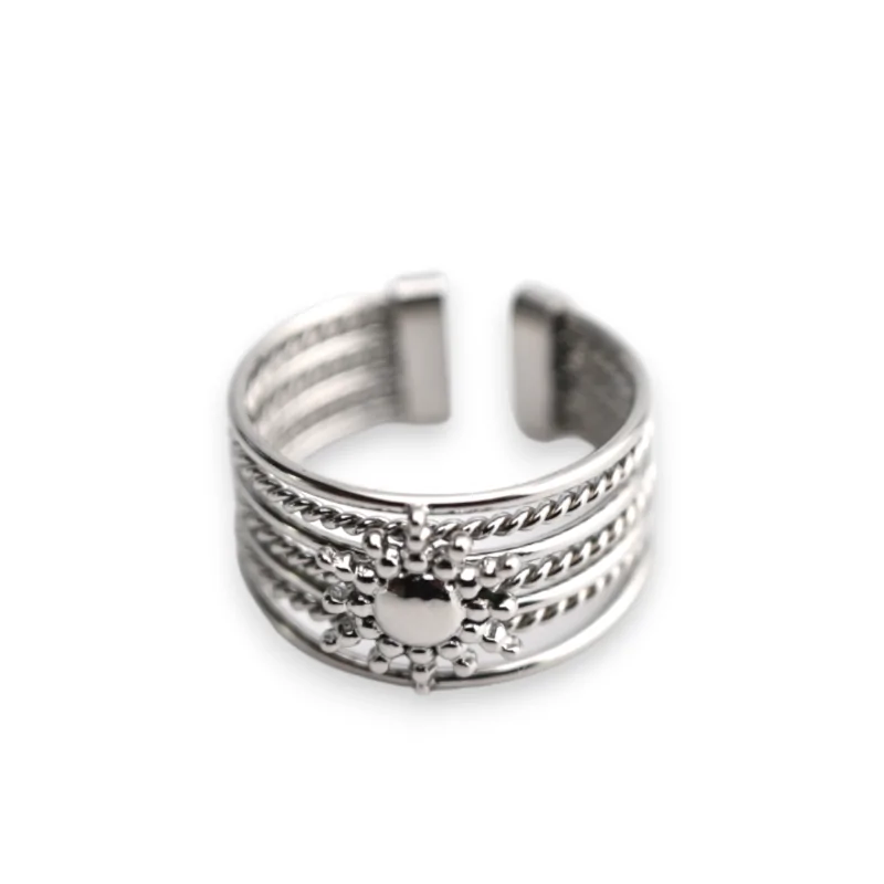 Confeccionada con cuidado en acero inoxidable y con un brillante acabado plateado, esta sortija es a la vez robusta y delicadamente refinada. Su diseño, amplio y elegante, destaca en su centro un hermoso pequeño sol plateado, símbolo intemporal de luz y vitalidad. La grabación del sol añade un toque único que eleva aún más la pieza, haciéndola aún más especial. Además, su estructura ajustable facilita su uso, ofreciendo una combinación perfecta de belleza y comodidad.