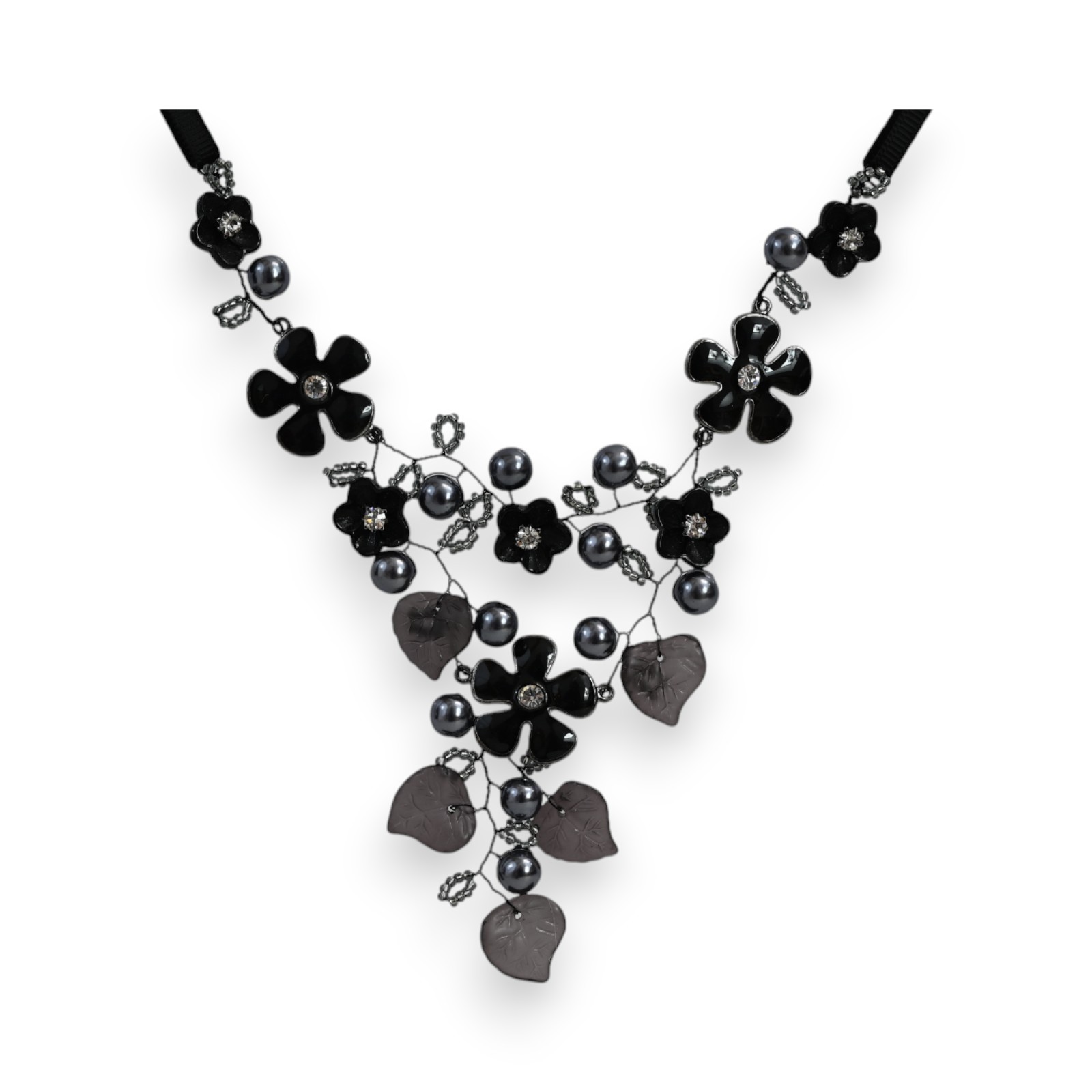 Verdadera pieza central de tu atuendo, esta joya de fantasía combina elegancia y originalidad. Los motivos florales negros realzados con detalles brillantes y las hojas a juego crean un conjunto armonioso ideal para complementar tus atuendos de noche o tus looks de ceremonia.