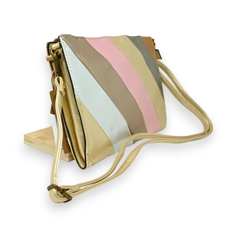 Sumérgete en un universo de encanto romántico con este encantador bolso de mano con acabados dorados. Sus franjas de colores pastel, brillantes y luminosas, captivan la mirada y añaden un toque de magia a tu estilo. Los tonos suaves evocan una dulzura sin igual, creando un ambiente glamuroso y romántico que complementa a la perfección tus atuendos delicados. En el interior, un bolsillo central con cremallera y bolsillos aplicados ofrecen un espacio práctico para guardar tus objetos esenciales, mientras que los bolsillos en la parte trasera te permiten acceder fácilmente a tus pequeños accesorios. La correa dorada, ajustable a tu gusto, añade un toque de elegancia adicional. Con sus dimensiones compactas de 26 por 20 centímetros, este bolso se convierte en el accesorio indispensable para expresar tu estilo con un toque de romanticismo refinado.