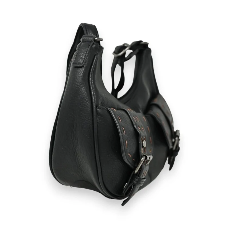 Este bolso bandolera Mandoline de material sintético negro combina estilo y funcionalidad. Sus dimensiones compactas de 28x19cm lo convierten en un accesorio ideal para el día a día. Equipado con dos bolsillos frontales decorativos con hebillas metálicas, un espacioso bolsillo central y un bolsillo trasero, ofrece numerosos compartimentos prácticos. Su correa ajustable permite un uso cómodo adaptado a cada persona.