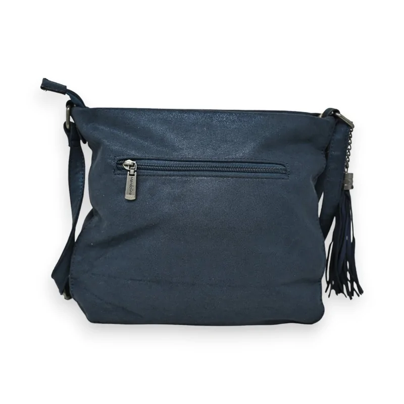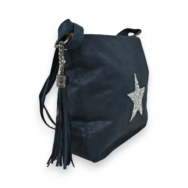 El ante azul marino ofrece una hermosa profundidad de color que combina perfectamente con atuendos casuales o más formales. La estrella brillante aporta un toque de glamour sutil, ideal para iluminar tus looks de noche. Gracias a su versatilidad, este bolso bandolera se convertirá rápidamente en tu aliado de moda en el día a día.
