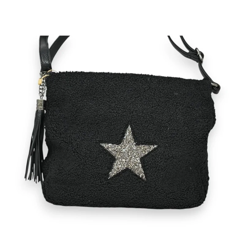 El bolso bandolera Mandoline de tejido rizado negro es el accesorio perfecto para combinar estilo y practicidad en el día a día. Su diseño minimalista se realza con una estrella central brillante que atrae sutilmente la mirada. Este bolso de tamaño medio (30x25cm) se adapta a todos los atuendos, desde el look casual hasta el más elegante.