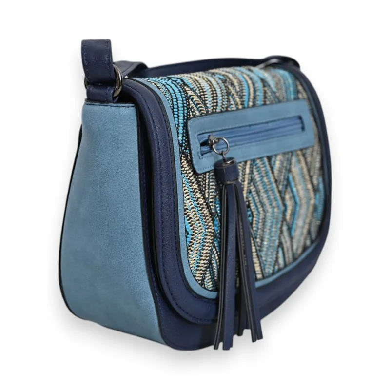 Este bolso bandolera Mélanie Paris combina elegancia y practicidad con su diseño estructurado y su original patrón tejido en tonos azules y beige. Su solapa rígida con cierre magnético y su bolsillo funcional en el frente ofrecen un fácil acceso a tus elementos esenciales.
