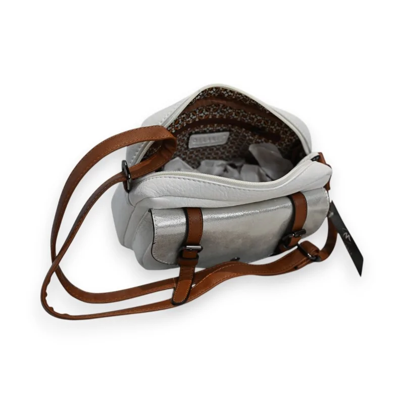 Este bolso bandolera Mélanie Paris se distingue por su apariencia sofisticada en sintético blanco, realzado por acabados brillantes que le confieren un aspecto premium. El frente del bolso está destacado por dos correas decorativas color camel que crean un contraste elegante y añaden un toque de carácter. El sistema de cierre con botón magnético combina seguridad y facilidad de uso, mientras que los detalles metálicos aportan un acabado cuidado al conjunto.