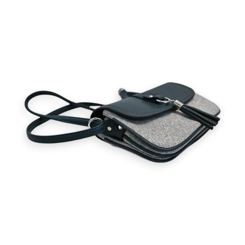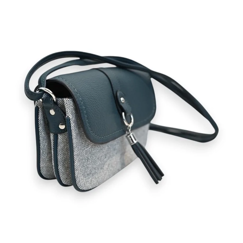El bolso bandolera Mélanie Paris se distingue por su combinación única de materiales nobles. La combinación del sintético azul petróleo y el lino moteado crea un contraste elegante que realza este modelo. Los acabados cuidados, especialmente la solapa en azul petróleo y los detalles metálicos plateados, demuestran una atención especial a los detalles. El cierre magnético asegura un cierre a la vez seguro y práctico.