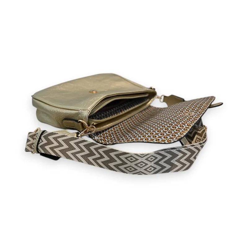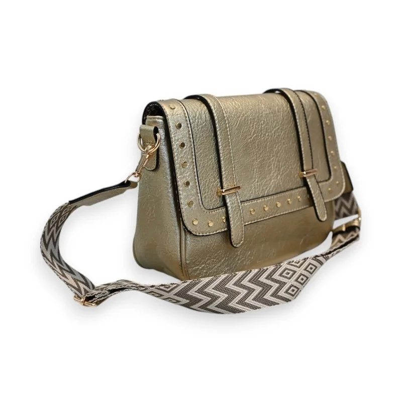 Este bolso bandolera Mélanie Paris combina elegancia y practicidad con su diseño retro-chic. Su color dorado y sus acabados tipo cartera le confieren un estilo vintage muy de moda. La correa étnica desmontable y ajustable aporta un toque bohemio moderno.