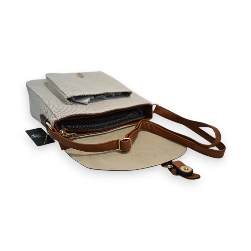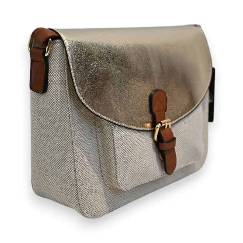 El bolso bandolera Mélanie Paris encarna la alianza perfecta entre practicidad y elegancia. Su diseño de doble material combina una tela de lino beige natural con una solapa dorada brillante, creando un contraste refinado. La correa ajustable de cuero camel y los acabados dorados añaden un toque de sofisticación a este modelo versátil.