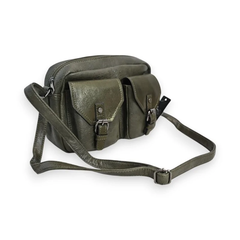 El bolso bandolera de la colección Mélanie Paris destaca por su diseño contemporáneo y su sofisticado acabado caqui. El material sintético utilizado reproduce a la perfección el aspecto y tacto del cuero auténtico, ofreciendo una alternativa ética y duradera. Las solapas delanteras en caqui brillante crean un elegante contraste con la textura mate del cuerpo del bolso, mientras que los acabados metálicos de los cierres añaden un toque de modernidad.