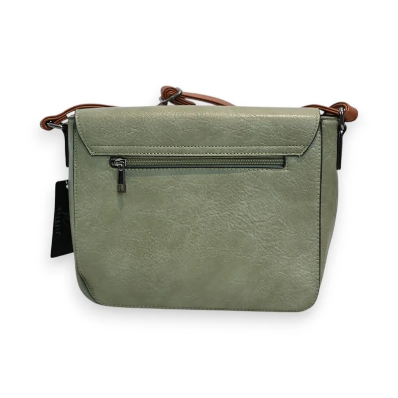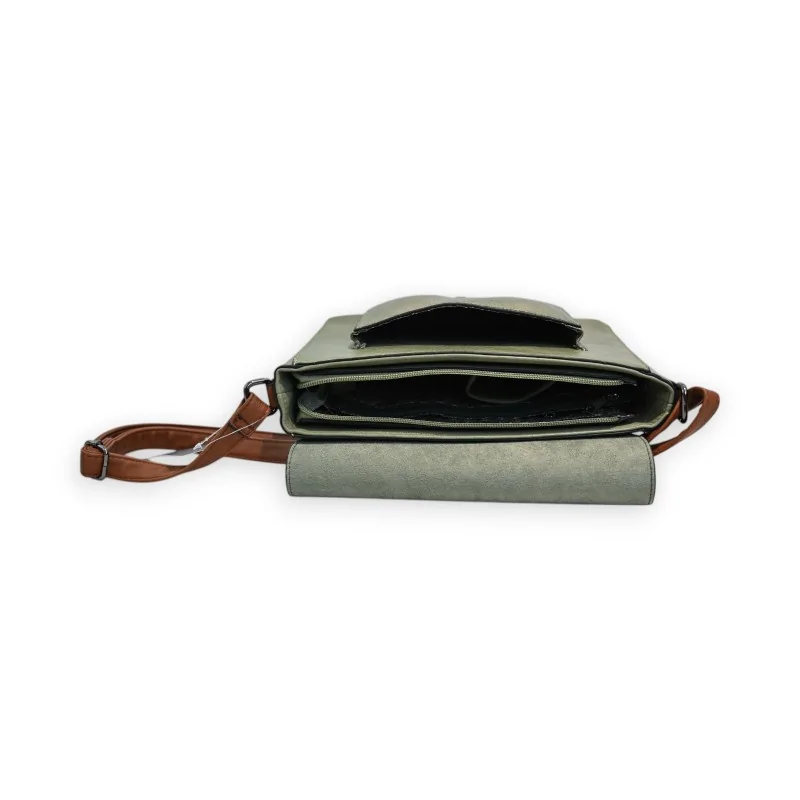 Este modelo de la colección Mélanie Paris se distingue por su estética contemporánea que combina el verde almendra delicado con toques elegantes de camel. El material sintético de alta calidad ofrece un acabado sofisticado, realzado por los detalles metálicos dorados que adornan el bolsillo frontal. La solapa, elemento distintivo de este modelo, cuenta con un cierre magnético discreto y eficaz, uniendo estilo y funcionalidad.