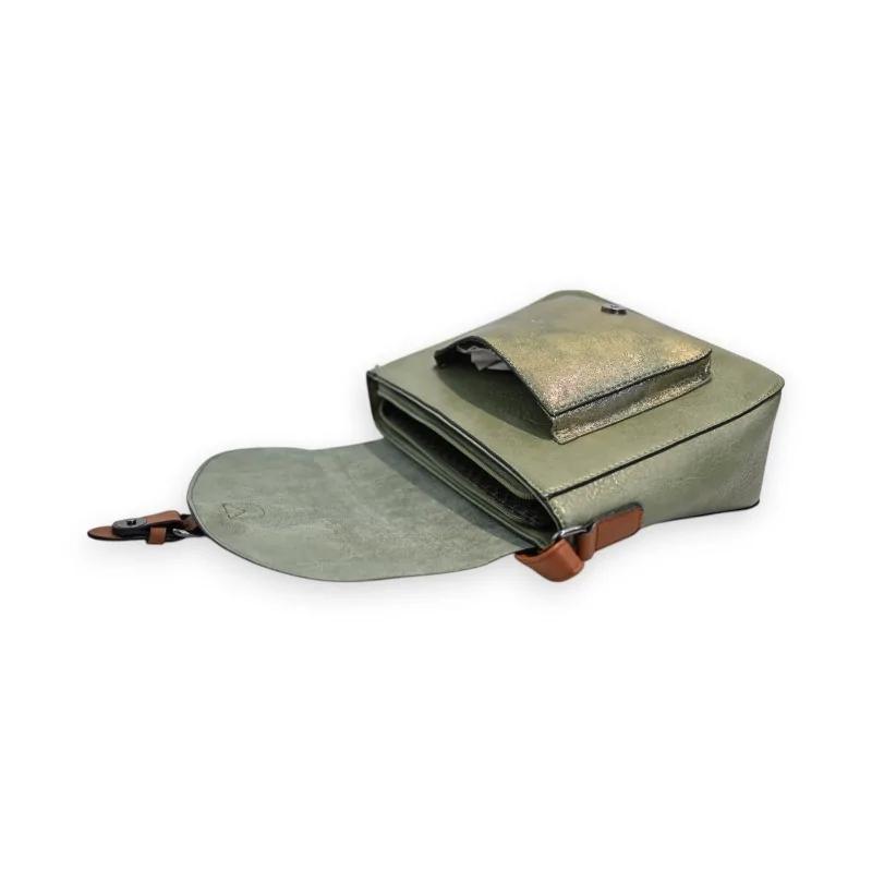 Este modelo Mélanie Paris se impone como un accesorio versátil, adecuado tanto para atuendos casuales como para looks más formales. El tono verde almendra, a la vez suave y sofisticado, armoniza perfectamente con los detalles en camel y dorado, creando un conjunto refinado que atraviesa las estaciones con elegancia.