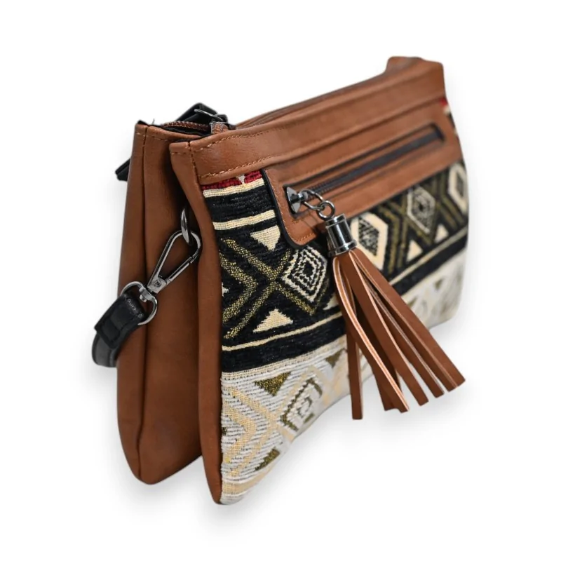 La calidad de fabricación se refleja en la cuidadosa elección de los materiales. La polipiel camel ofrece una resistencia óptima manteniendo una estética refinada. El tejido étnico, cuidadosamente seleccionado, presenta una excelente durabilidad y motivos geométricos finamente tejidos. Los acabados cuidados, especialmente en las costuras y cremalleras, garantizan la durabilidad del bolso.