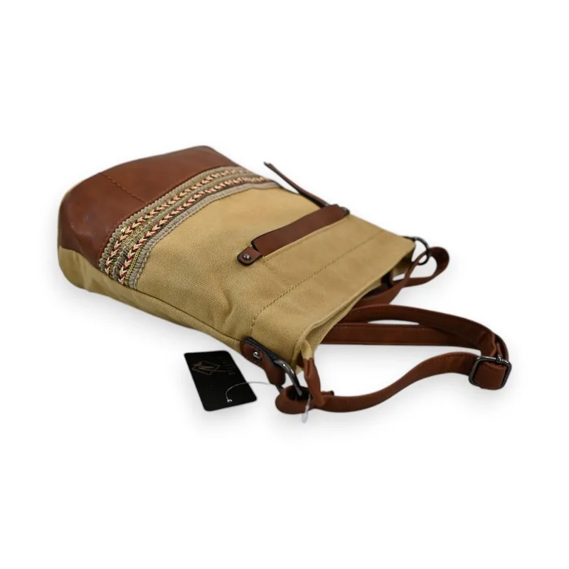 El bolso bandolera Mélanie Paris se distingue por su estilo bohemio refinado que combina con elegancia una lona beige resistente y elementos de cuero sintético marrón. La banda decorativa étnica que adorna la parte inferior del bolso aporta un toque de originalidad y revela una artesanía meticulosa. Los acabados en cuero marrón en las esquinas y el bolsillo frontal subrayan la calidad de fabricación y refuerzan la durabilidad del bolso.