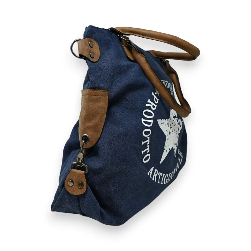 Este bolso vintage, confeccionado en un tejido grueso de color azul jeans, se distingue por su diseño llamativo con una estrella negra brillante en el centro, resaltada por escrituras a juego. Los acabados en sintético camel, incluyendo una correa de hombro armonizada, enriquecen su apariencia ofreciendo diversas opciones de transporte. Los ganchos de mosquetón situados en cada lado permiten modificar la longitud del bolso, añadiendo un aspecto versátil a su estilo. En la parte trasera, un bolsillo con cremallera asegura la seguridad de tus bienes más preciados, mientras que el gran bolsillo central, también asegurado por una cremallera, está flanqueado por bolsillos planos para una organización eficiente. Con sus generosas dimensiones de 45 cm por 42 cm, este bolso es tan práctico como elegante, ideal para un uso diario o para salidas especiales.