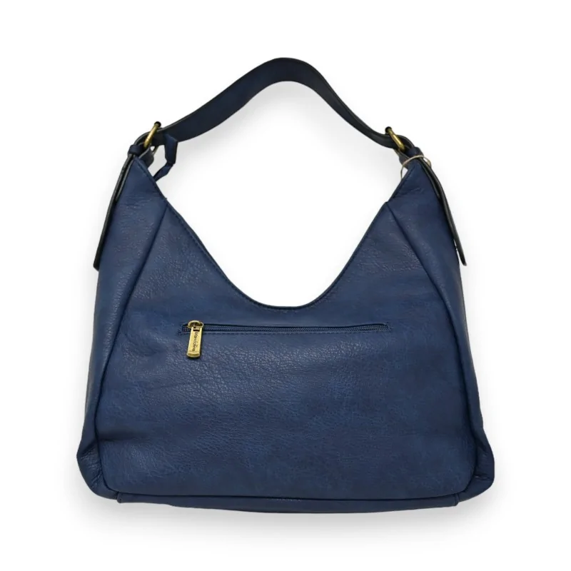 La comodidad de uso ha sido una prioridad en el diseño de este bolso azul marino. Su asa fija, sólida y ergonómica, asegura un cómodo transporte en el hombro, ideal para tus desplazamientos diarios. Para una mayor versatilidad, el bolso también está equipado con una correa ajustable y desmontable. Esta opción te permite adaptar el transporte del bolso según tus preferencias y actividades, pasando fácilmente de un estilo elegante llevado en la mano a un transporte más informal en bandolera.