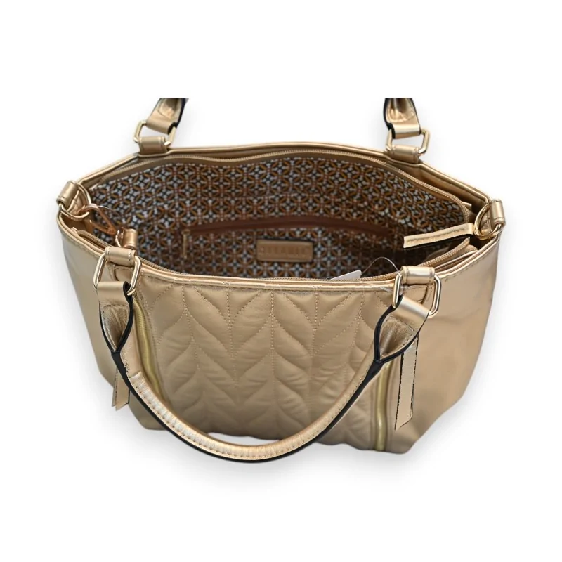 El bolso Mélanie Paris se distingue por su elegante acolchado geométrico que adorna su parte delantera. Este sofisticado acabado se realza con el revestimiento sintético dorado que captura y refleja la luz con sutileza. Las cremalleras metálicas doradas armonizan perfectamente con el conjunto, creando una notable coherencia visual. El forro interior con motivo vintage añade un toque retro chic que contrasta deliciosamente con el aspecto moderno del exterior.
