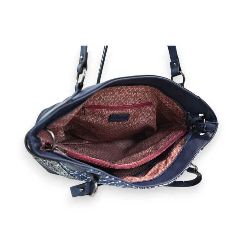 El bolso de mano Mélanie Paris se impone como el accesorio ideal para mujeres activas que buscan elegancia y practicidad. Su diseño único de patchwork combina diferentes texturas sobre un sofisticado fondo azul marino, creando un estilo a la vez moderno y atemporal.