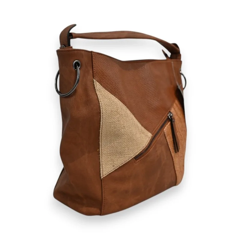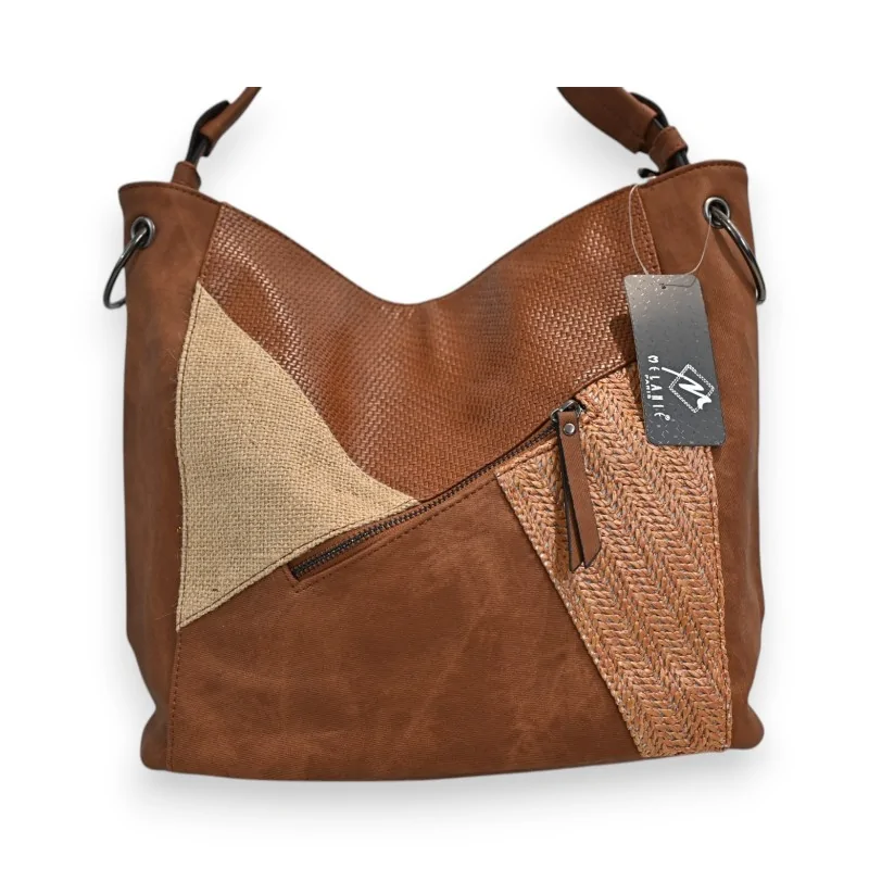 El bolso de mano Mélanie Paris en sintético camel se distingue por su elegante patchwork que combina diferentes texturas y materiales. Su diseño contemporáneo mezcla hábilmente superficies lisas, trenzadas y texturizadas, creando un efecto visual único y sofisticado. El diseño práctico ofrece múltiples espacios de almacenamiento, incluyendo un bolsillo frontal con cremallera y un amplio compartimento central.