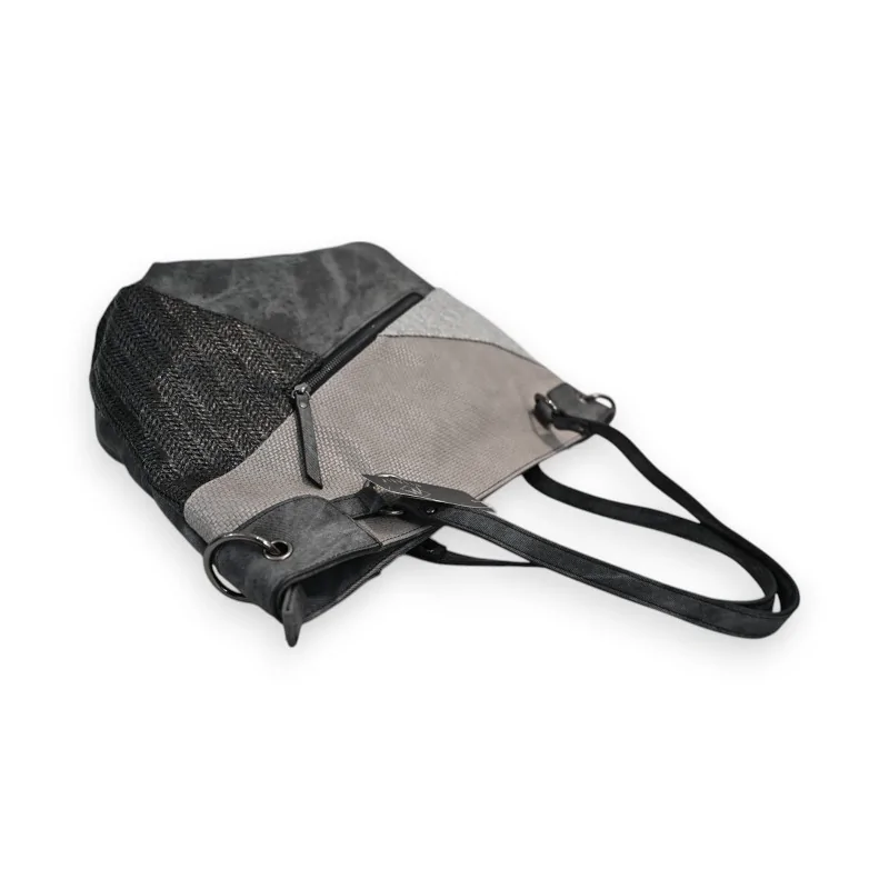 El bolso Mélanie Paris se distingue por su estética única que combina hábilmente diferentes texturas en un sofisticado patchwork. La alternancia de materiales sintéticos desgastados, superficies texturizadas y diversos acabados crea un efecto visual impactante. Los tonos de gris y negro se armonizan perfectamente, ofreciendo una pieza elegante y versátil que combina con numerosos atuendos.