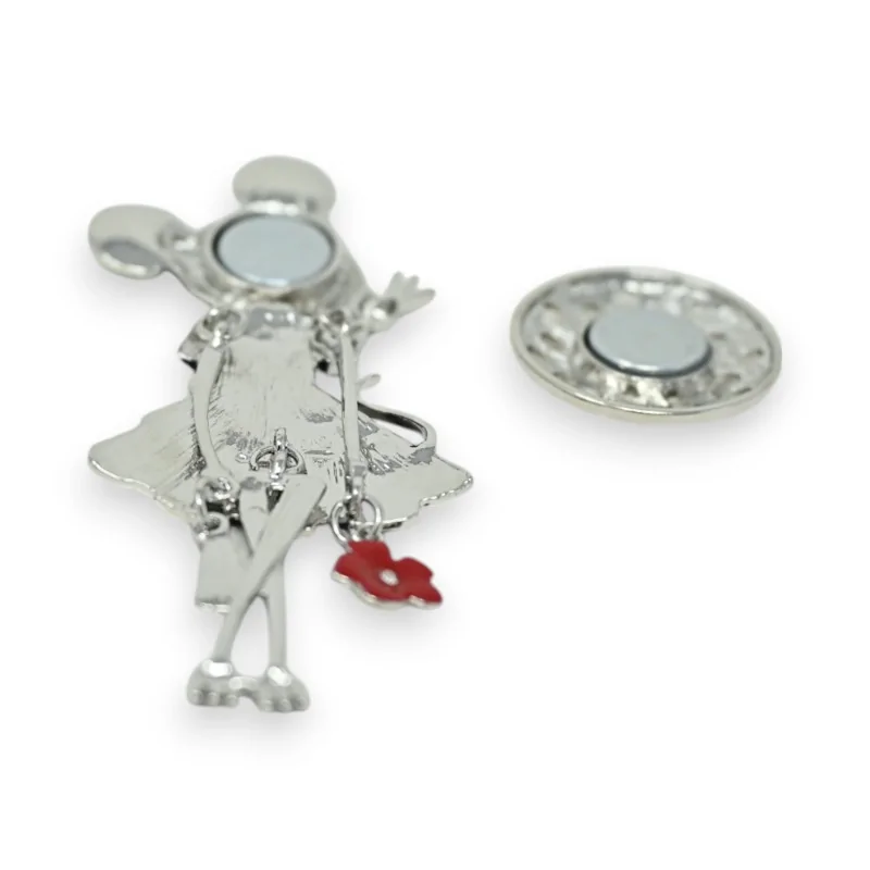 Este broche magnético de ratón en metal plateado es un accesorio de moda original y a la última. Con un tamaño de 10x4 cm, representa un adorable ratoncito negro que lleva un vestido floreado multicolor. Sus ojos muy abiertos y su postura divertida le dan un aire travieso que no pasará desapercibido. Perfecto para añadir un toque de fantasía a tus atuendos.