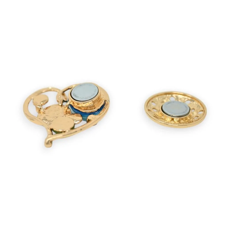 Este magnífico broche en forma de corazón combina elegancia y originalidad con su diseño único que mezcla un árbol de la vida esmaltado en azul turquesa y elementos decorativos coloridos. El marco dorado de 4.5cm delicadamente trabajado realza una gran piedra turquesa, acompañada de acentos rosas, verdes y naranjas, así como un cristal brillante. Su sistema de sujeción magnético lo hace particularmente práctico y ayuda a preservar su ropa.