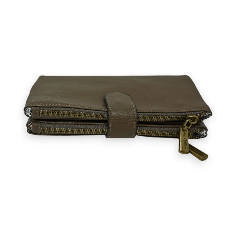 La cartera de mano Mandoline en sintético color topo combina elegancia y practicidad. Equipada con múltiples compartimentos, incluyendo 2 bolsillos con cremallera y un espacio para cheques, se adapta a todas tus necesidades. Su formato compacto de 19x11cm y su cierre magnético la convierten en el accesorio ideal para el día a día. Con sus acabados cuidados y su estilo vintage, esta cartera versátil se volverá rápidamente indispensable.
