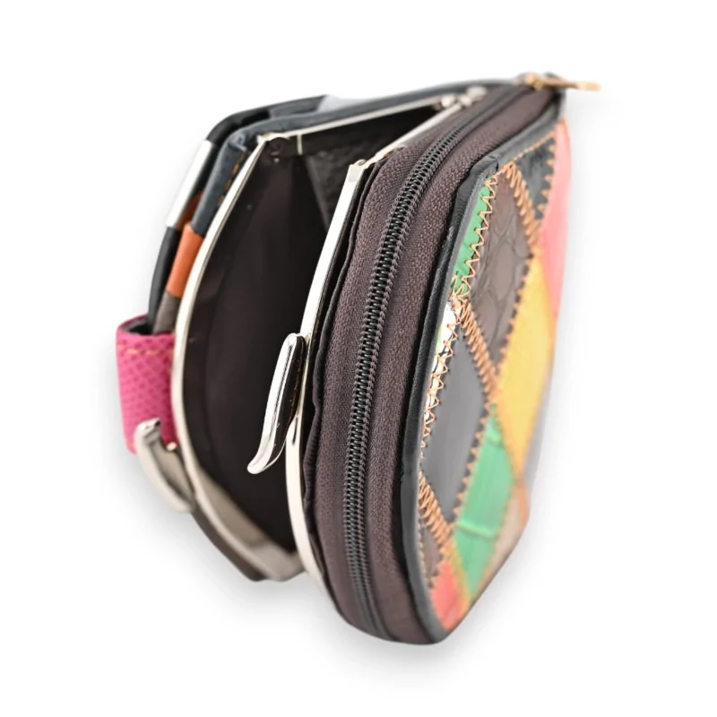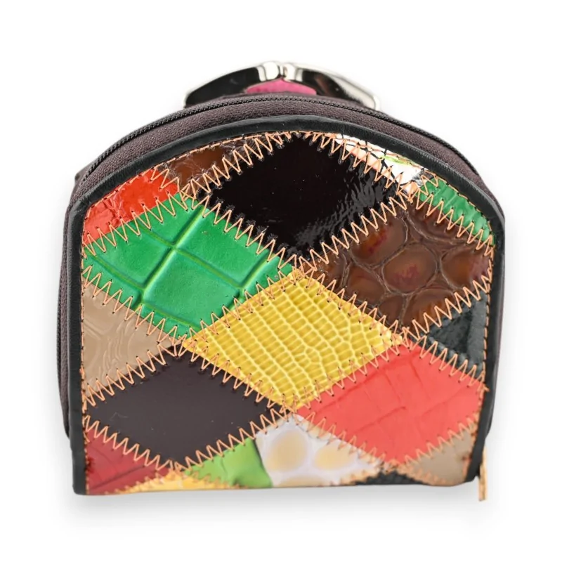 La cartera compacta de patchwork Kenny Jones destaca por su diseño original y colorido. Fabricada en cuero de calidad, luce un patchwork de diferentes tonos y texturas que la convierten en una pieza única. Sus dimensiones reducidas de 10,5 × 11 × 4 cm la hacen el accesorio ideal para quienes buscan una cartera discreta pero funcional. A pesar de su tamaño compacto, ofrece numerosos compartimentos prácticos para organizar sus efectos personales diarios.