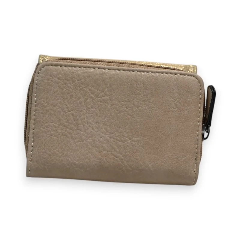 La cartera compacta Mélanie Paris combina elegancia y funcionalidad en un formato ideal para el uso diario. Su acabado en cuero sintético topo realzado con una solapa dorada brillante y una correa camel ofrece un estilo sofisticado. Sus dimensiones de 14 x 9 x 2,5 cm la convierten en un accesorio perfecto para todos los bolsos.